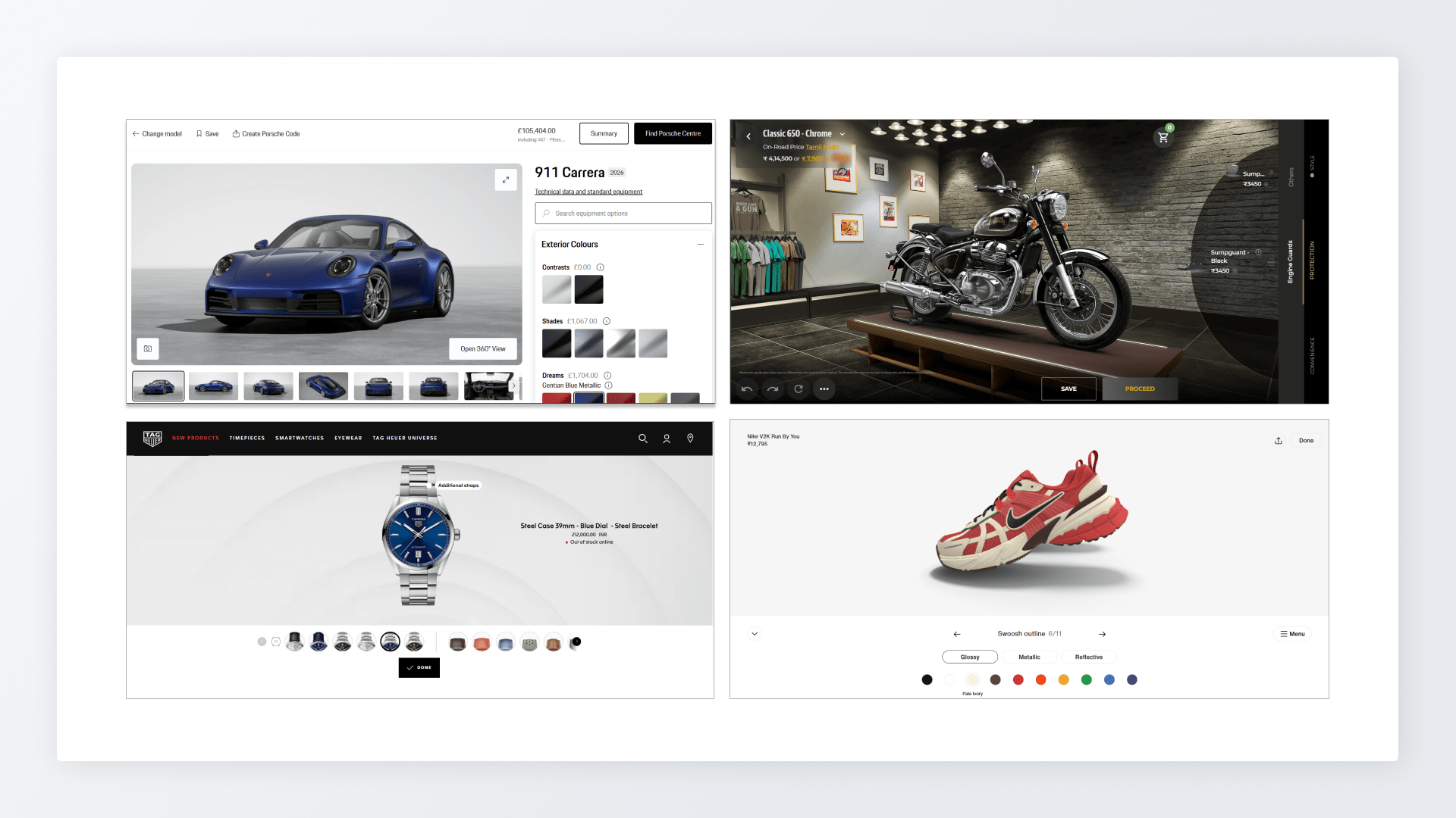 Since jewelry lacked good references, I researched configurators in industries where customization is already standard. Porsche, Royal Enfield, Tag Heuer, and Nike provided the patterns I needed. Clear step navigation, price visibility on every change, and large 3D previews helped shape the interaction model. I adapted those UX patterns to a fine jewelry context by simplifying choices and keeping only the information that supports a purchase decision.
