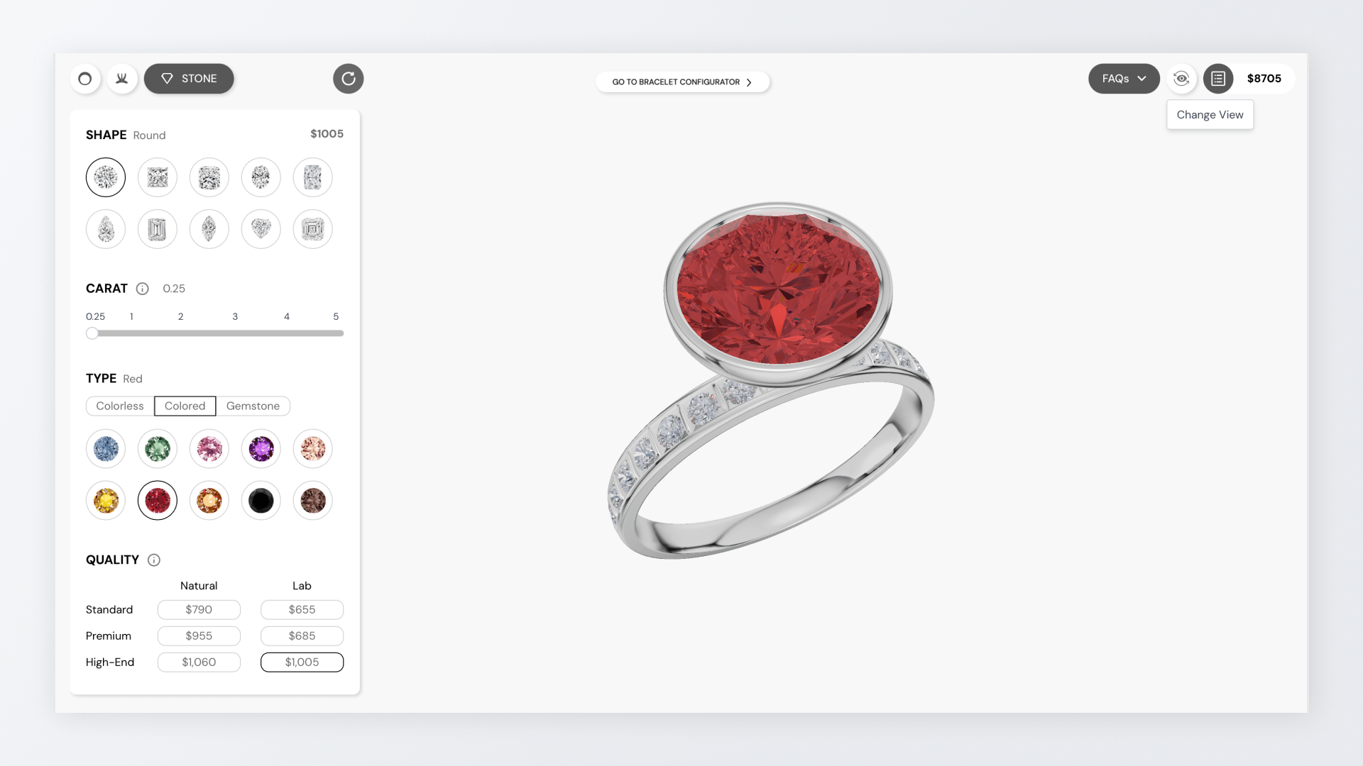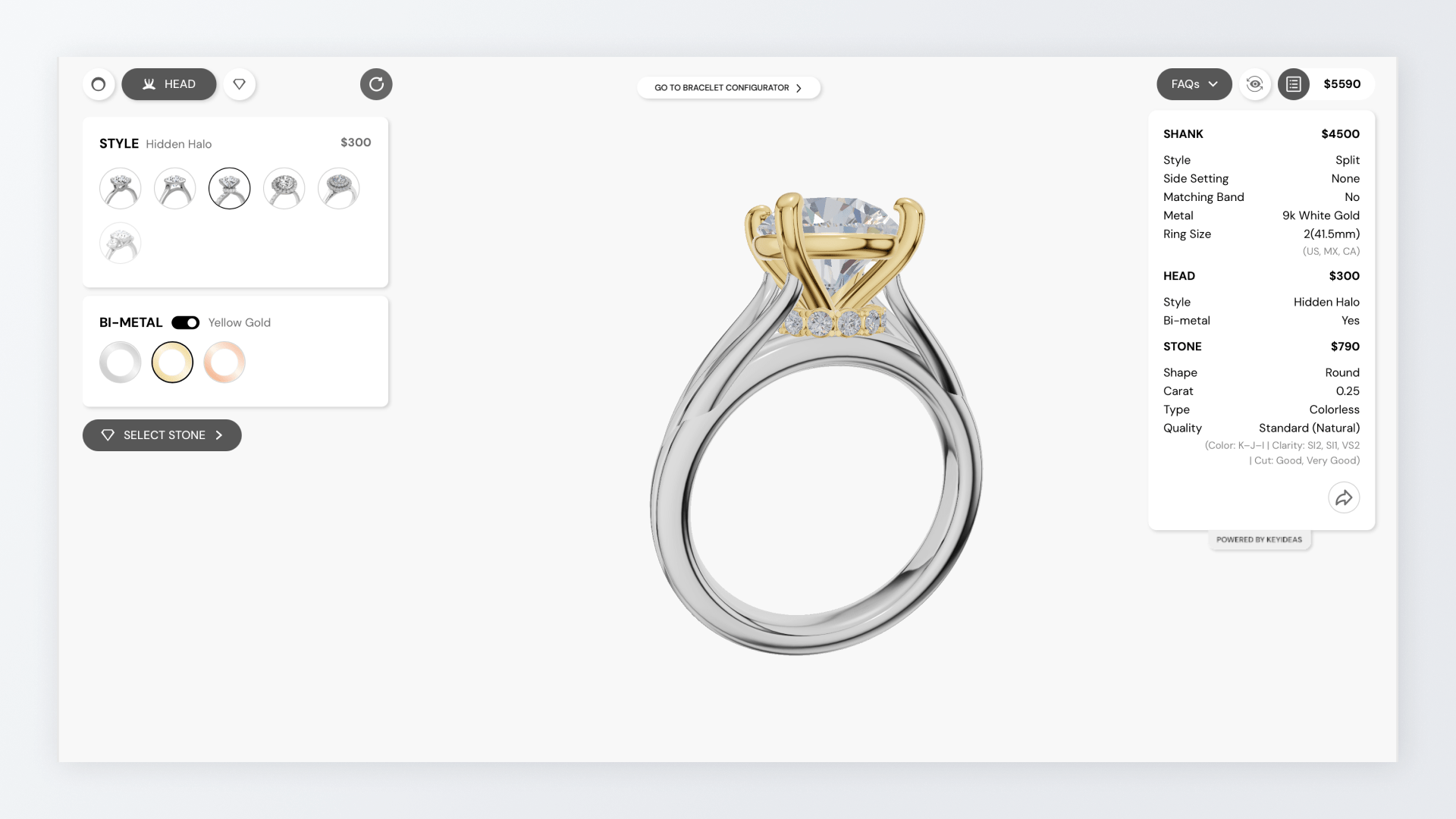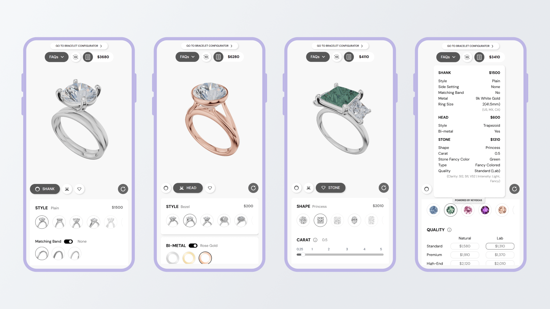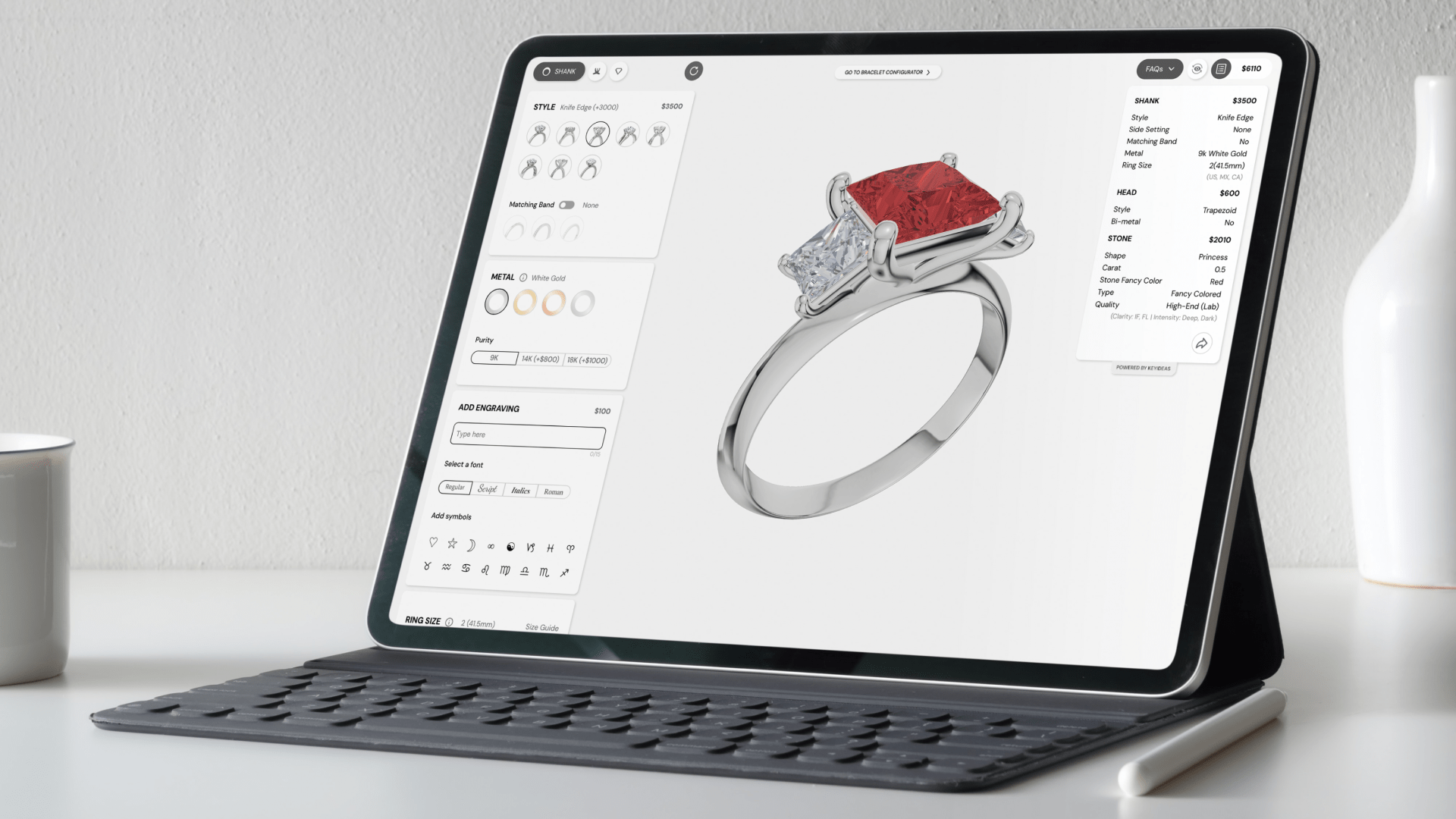 I led the end-to-end product experience, from information architecture to final UI. The ring, bracelet, and necklace flows were designed as a unified system, with a guided interaction model that simplifies complex configuration choices. I also designed the admin interface that allows jewelers to manage pricing, options, and rules. The 3D assets were built within my team using a workflow I defined for modeling and optimization.