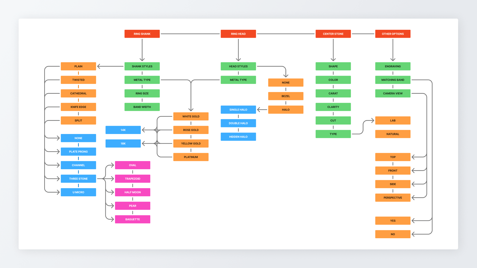 I started from the structure of an engagement ring. The information architecture breaks the product into shank, head, stone, and supporting options such as matching band, engraving, and purity. Each branch has its own rules for styles, metals, shapes, price tiers, and options that can or cannot be combined. This map became the foundation for UX decisions and made the flow predictable for developers and 3D artists.