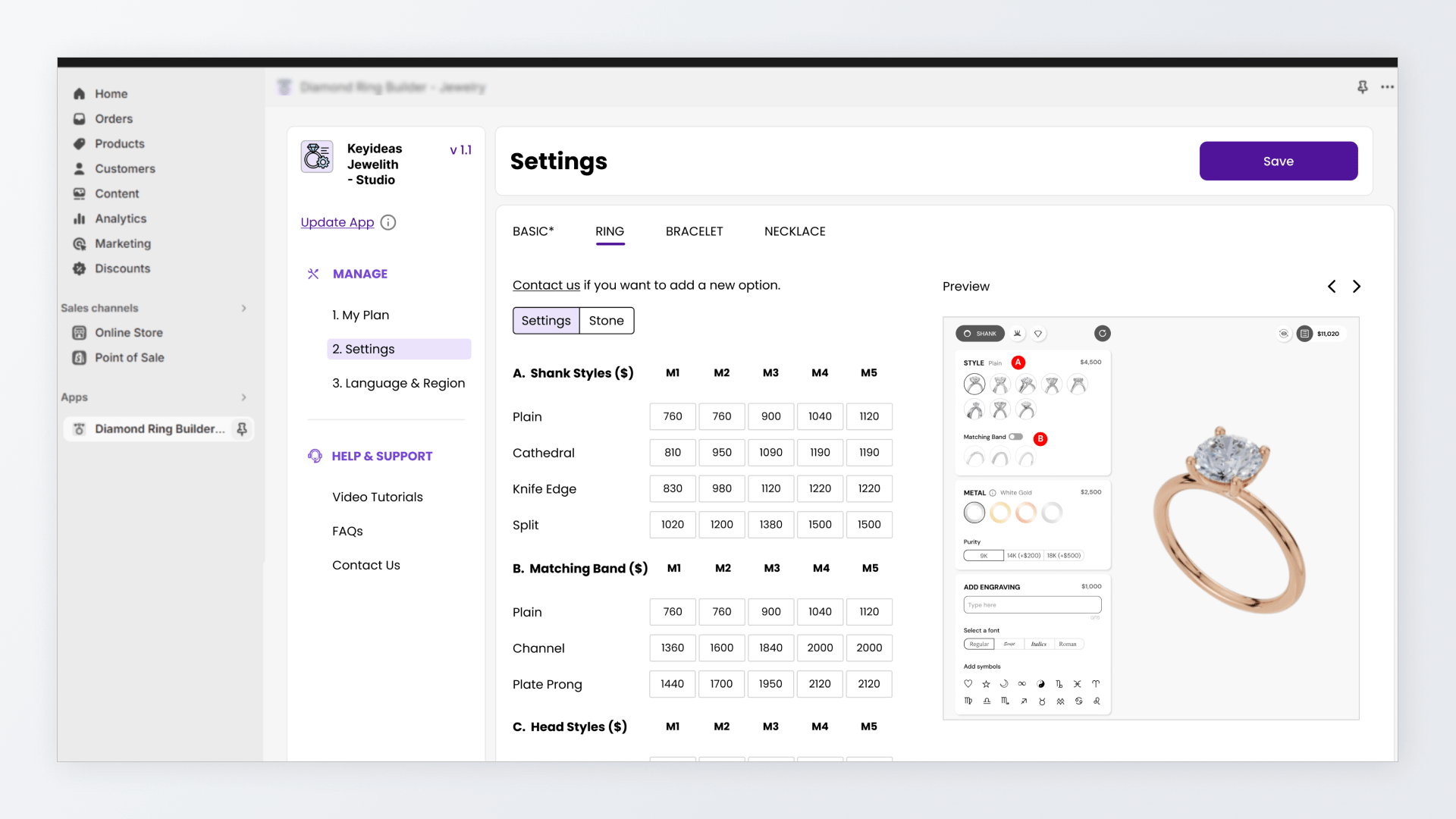 A separate settings view exposes the full pricing matrix. Each shank style, matching band, head style, and stone option can have different prices for purity and quality. The layout uses a clean table structure so jewelers see what they are editing without losing context. It feels familiar for anyone used to managing inventory or spreadsheets inside their store backend.