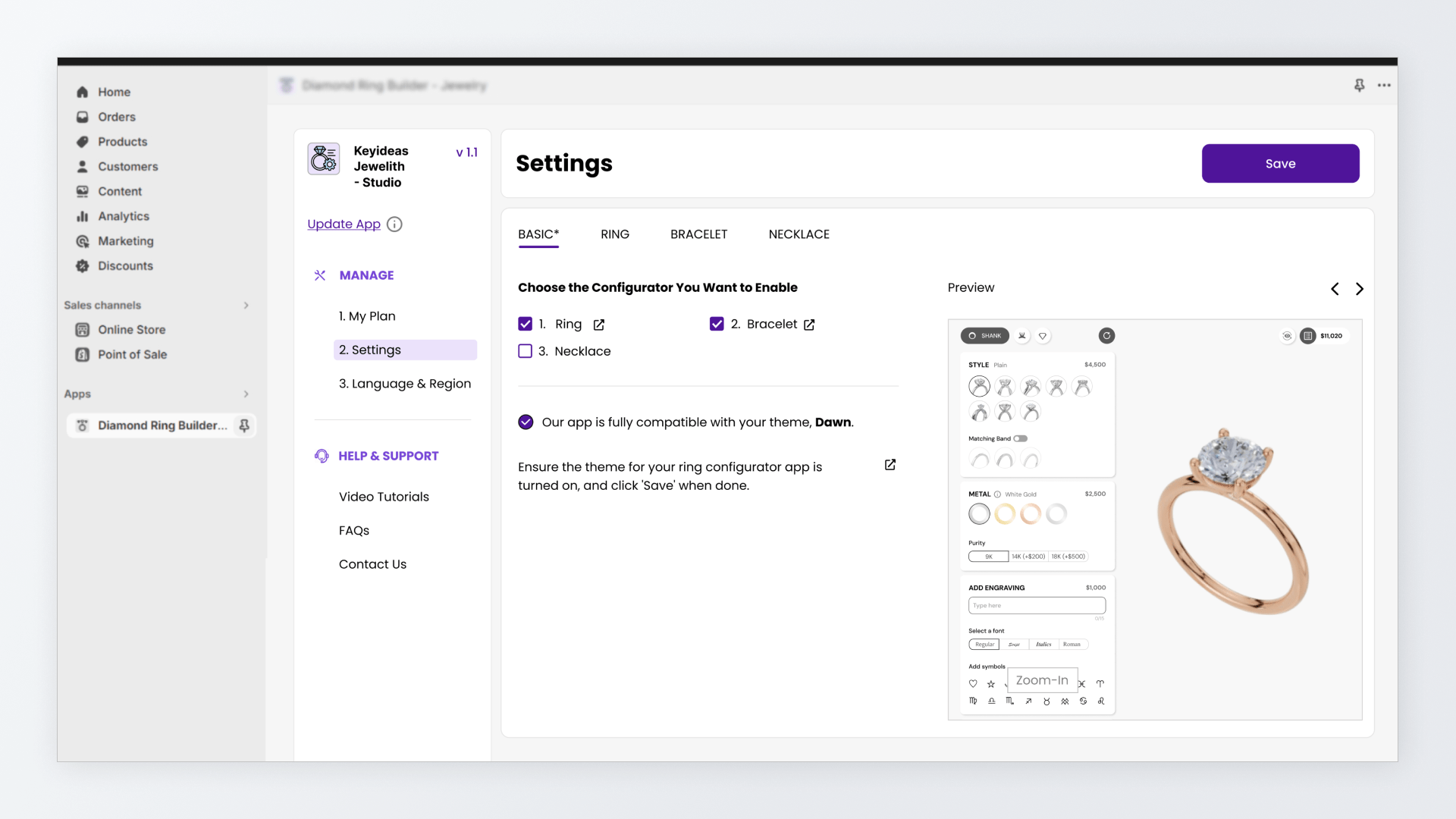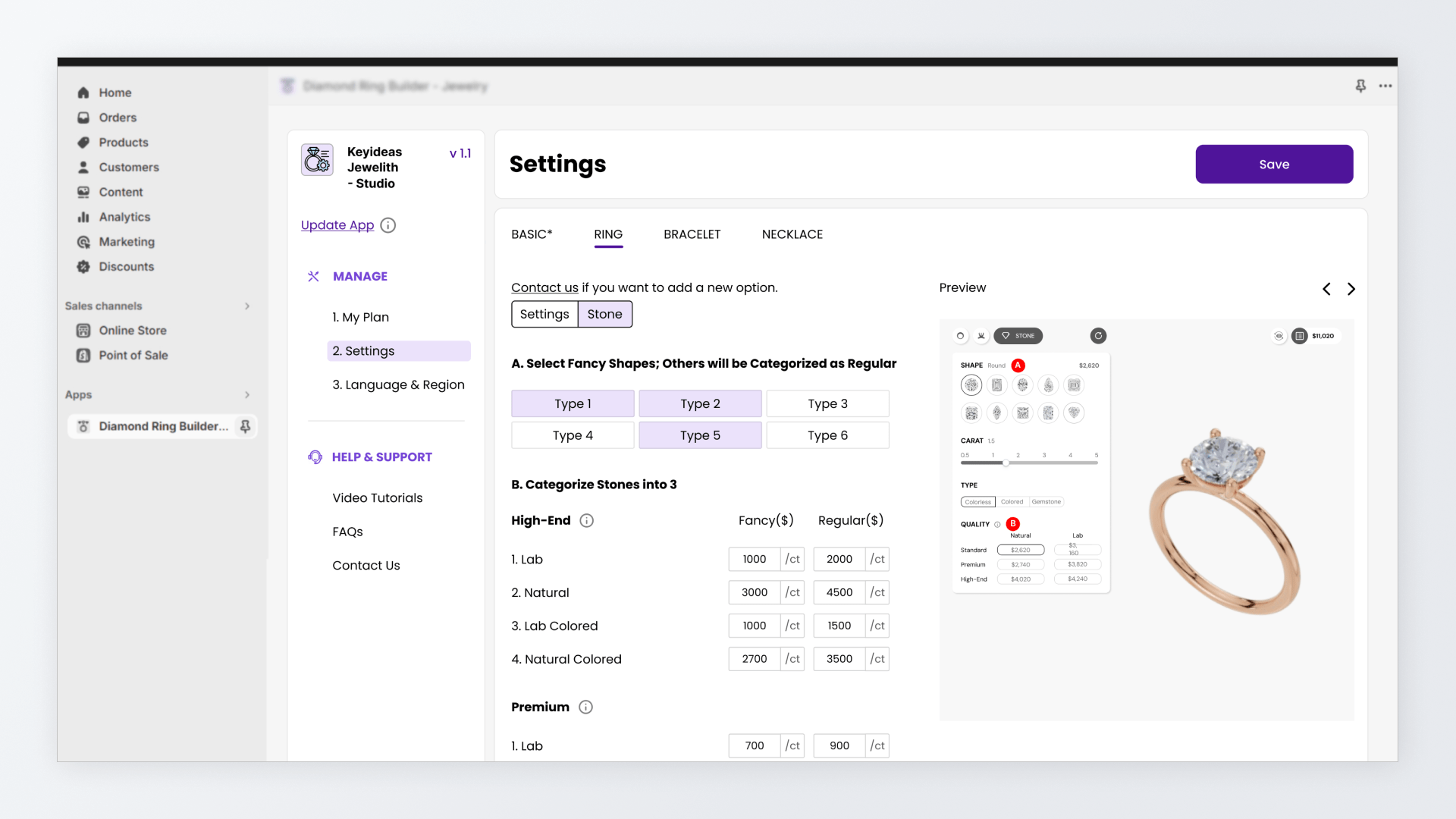 The app includes an admin dashboard inside Shopify and WooCommerce for jewelers to manage configuration rules. Here they can enable or disable a configurator, choose which categories they want to sell, change pricing for styles, metals, and quality tiers, and control how their designs appear in the builder.