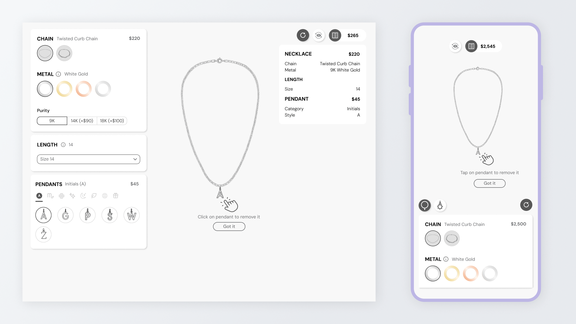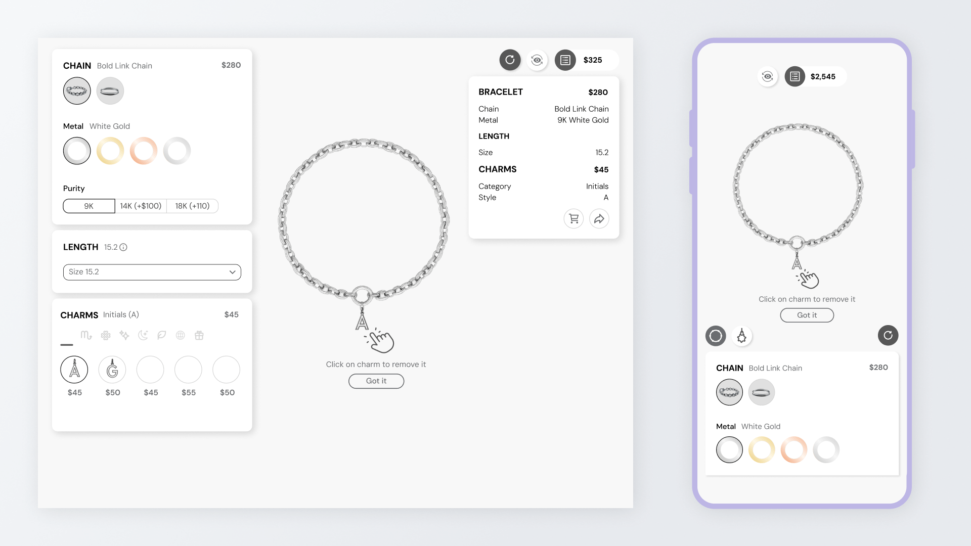 When the ring builder was stable, I extended the same interaction model to bracelets and necklaces. Both flows are based on two elements. Bracelets have chain and charms. Necklaces have chain and pendant. Users can pick the base design, change metal and purity, and build their own combinations. Because both tools share the same logic and layout, they feel like a single product system.