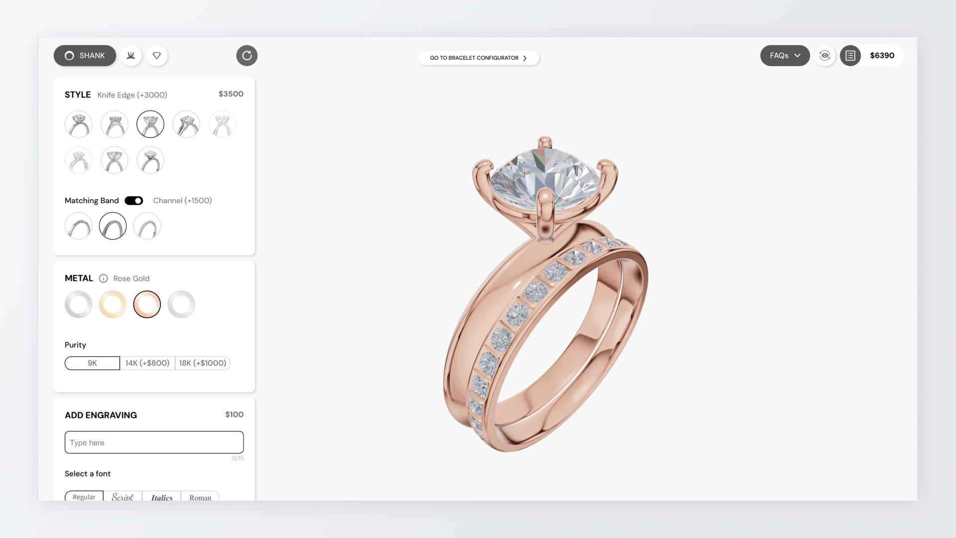 The shank flow handles the most complex decisions. Style, matching band, metal, purity, and engraving sit in a guided workflow. When someone chooses a shank style, only relevant secondary options appear. Micro interactions and quick help text show how each choice affects the look and the price. Every change updates the 3D model live, so users do not need to imagine the result.