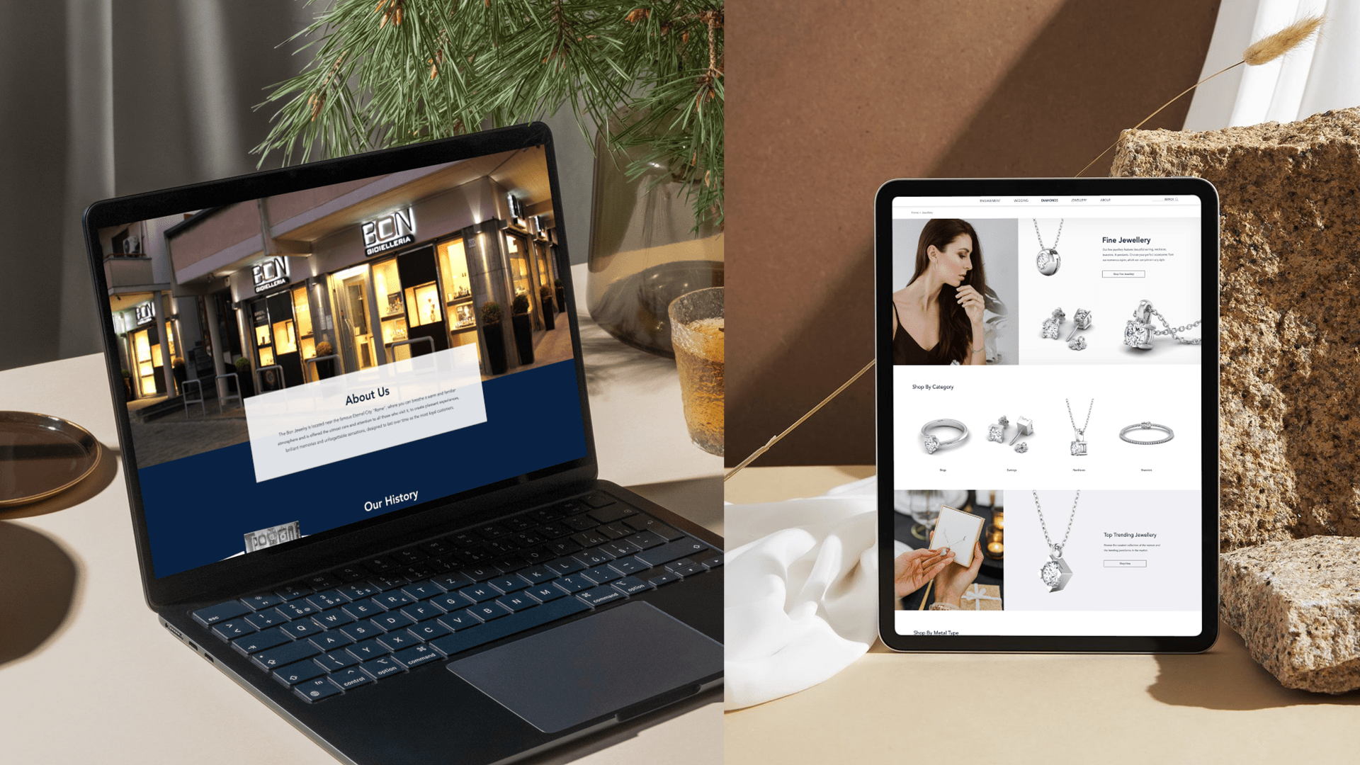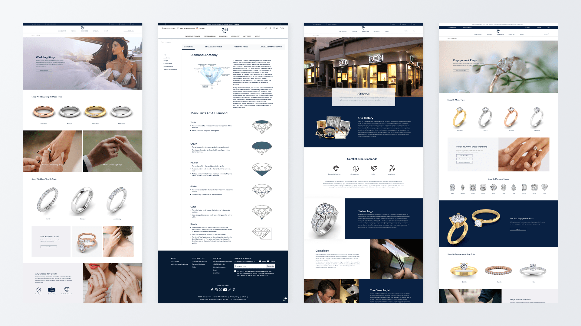 The wedding ring and fine jewelry pages required a slightly different tone, emphasizing variety, craftsmanship, and style discovery. The layouts highlight collections visually while keeping navigation simple and distraction-free.