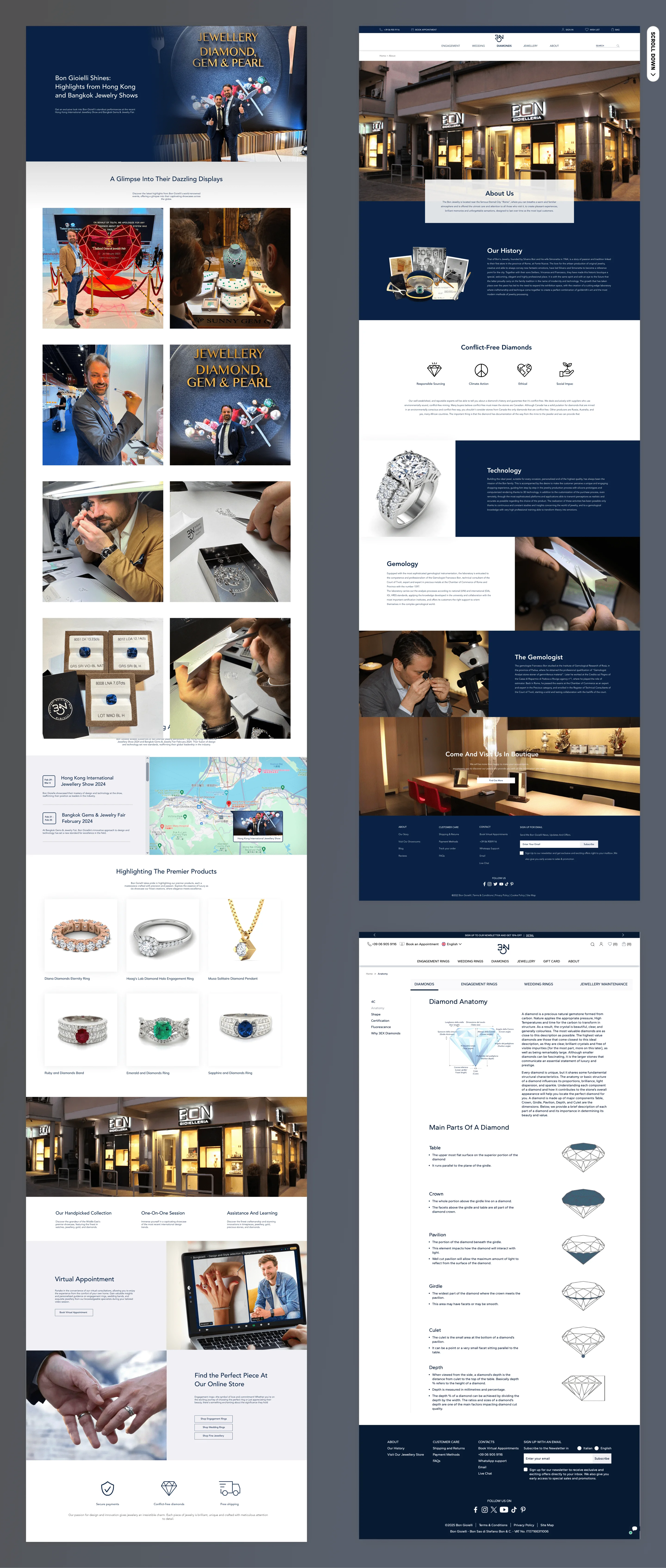 Event pages were designed to showcase Bon Gioielli’s presence at international jewelry events, reinforcing credibility and global brand presence. The About page communicates the brand story and values in a structured, readable format, while education pages simplify complex jewelry concepts to support confident buying.