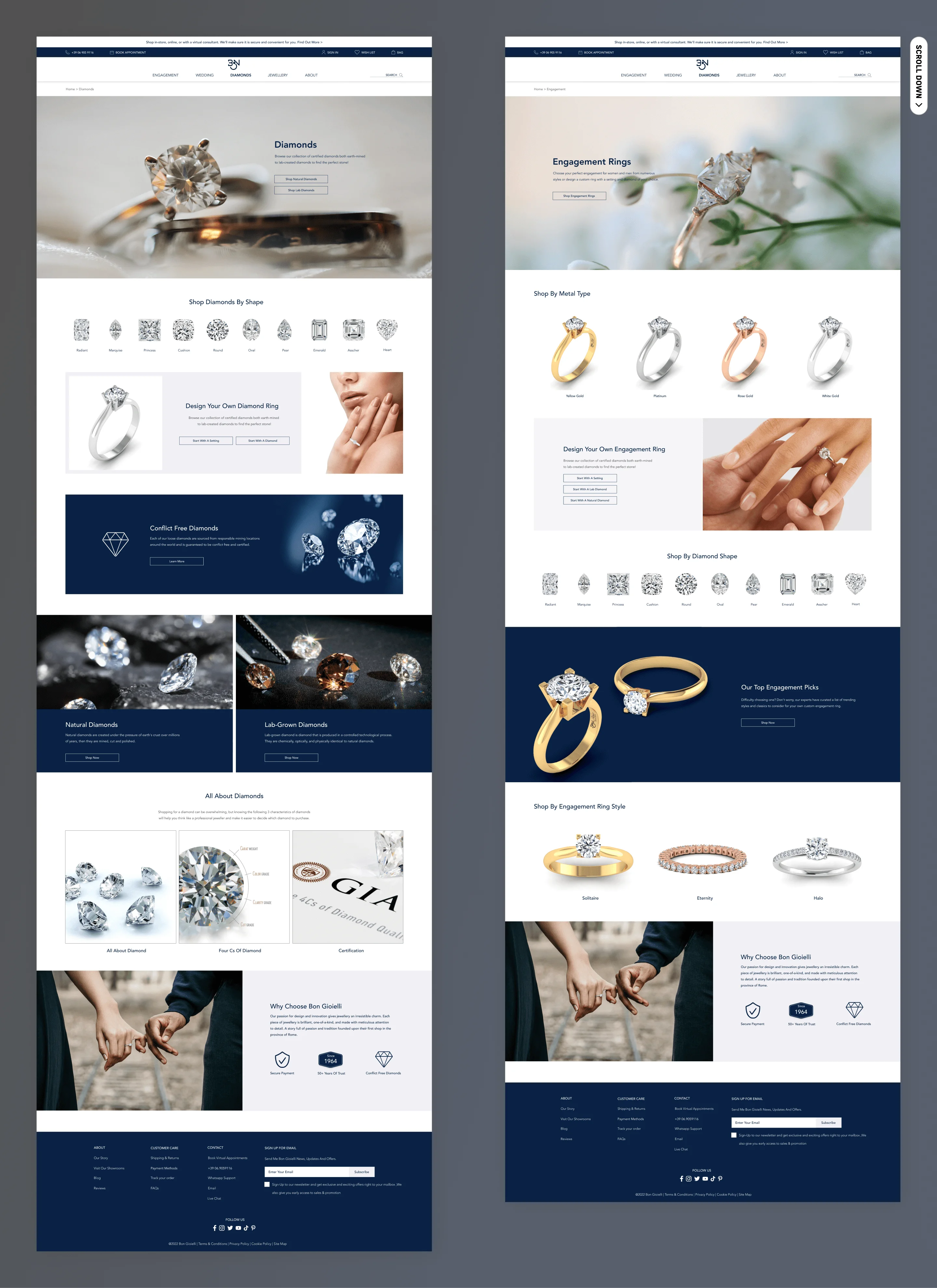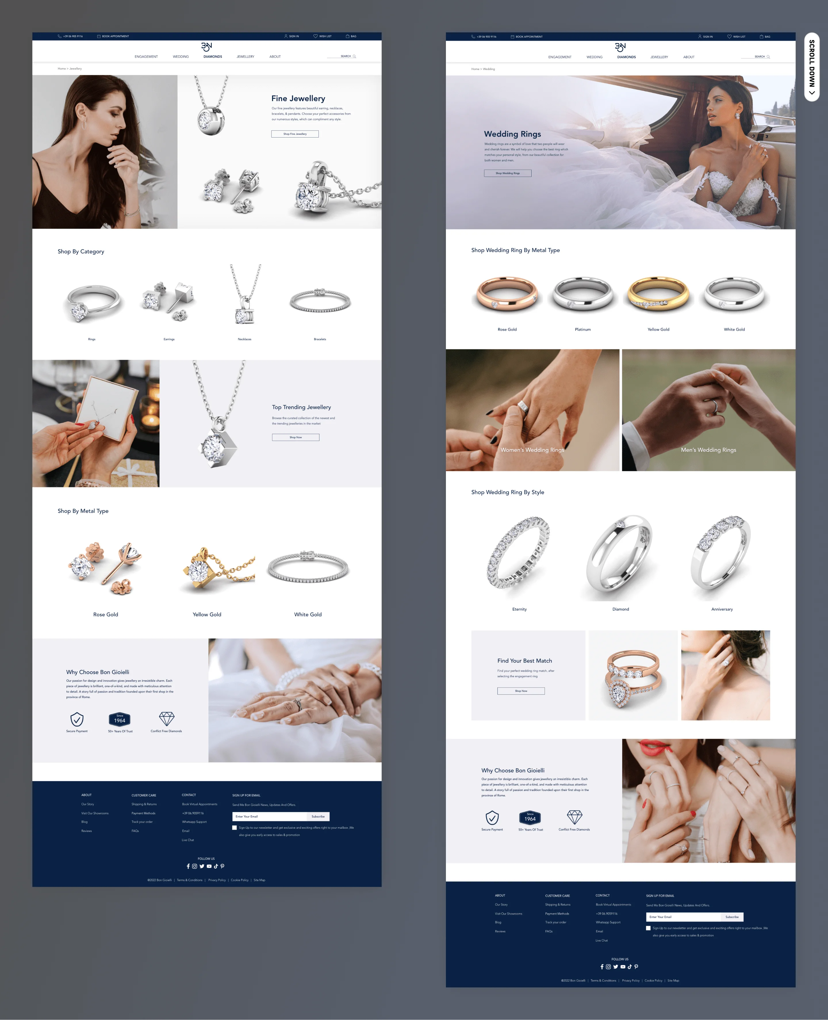 Bon Gioielli is an Italian fine jewelry brand offering engagement rings, wedding rings, diamonds, and fine jewelry. The scope of this project focused on designing multiple high-intent landing pages rather than a single homepage. Each page needed to balance visual elegance with commercial clarity, supporting both brand positioning and direct product discovery.