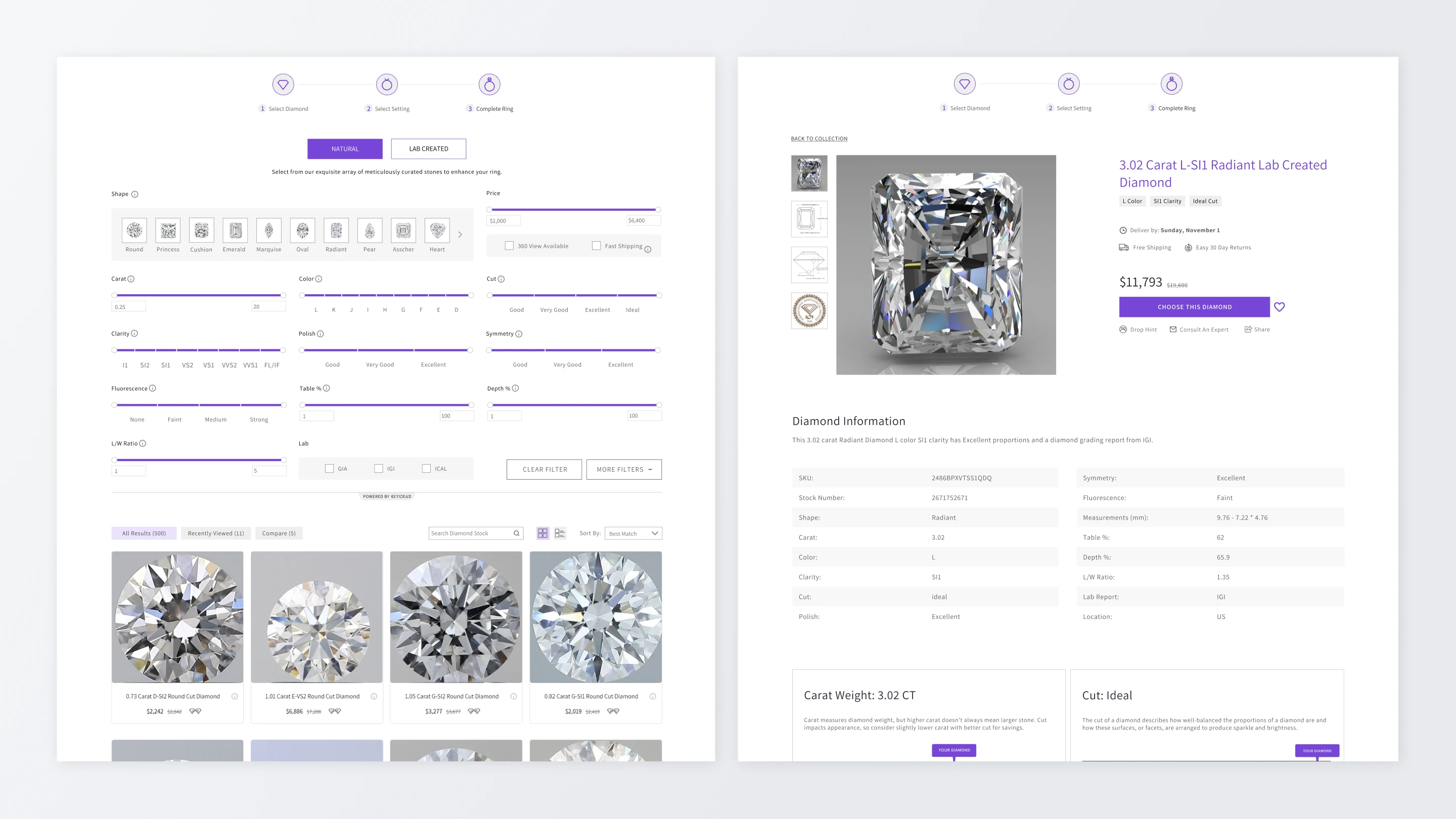 Guided Customization Flow: Users explore ring styles first, then move into diamond selection while seeing changes reflected in real time.