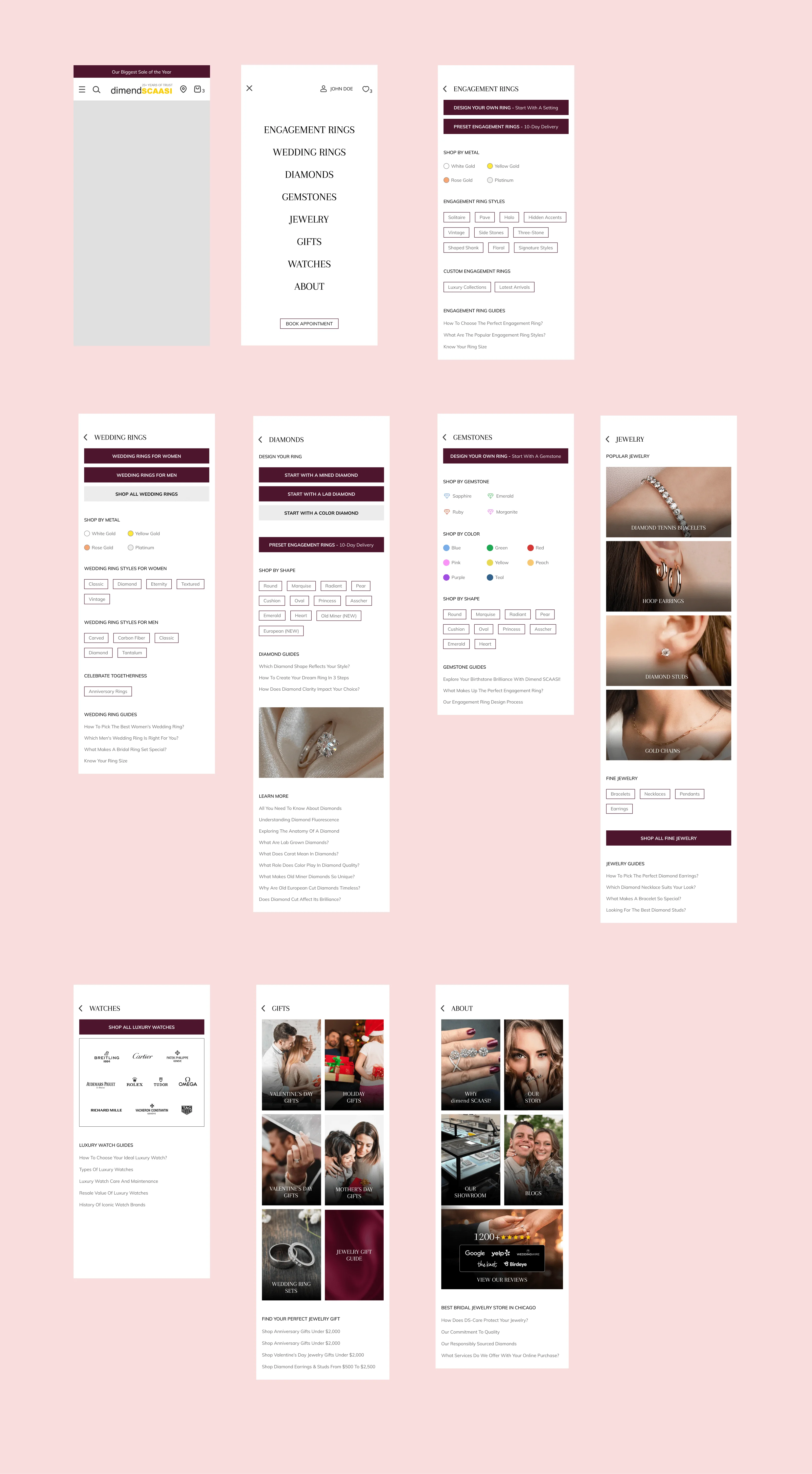 Dimend Scaasi is a Chicago-based luxury jewelry brand with 25+ years of heritage in engagement rings, wedding rings, diamonds, fine jewelry, and Swiss watches. The website already generated strong traffic and sales, but the UX and visual identity had not been updated for several years. The goal was to redesign the experience to feel modern, premium, and differentiated from other jewelry sites while improving conversion through clarity, visual trust, and product storytelling.