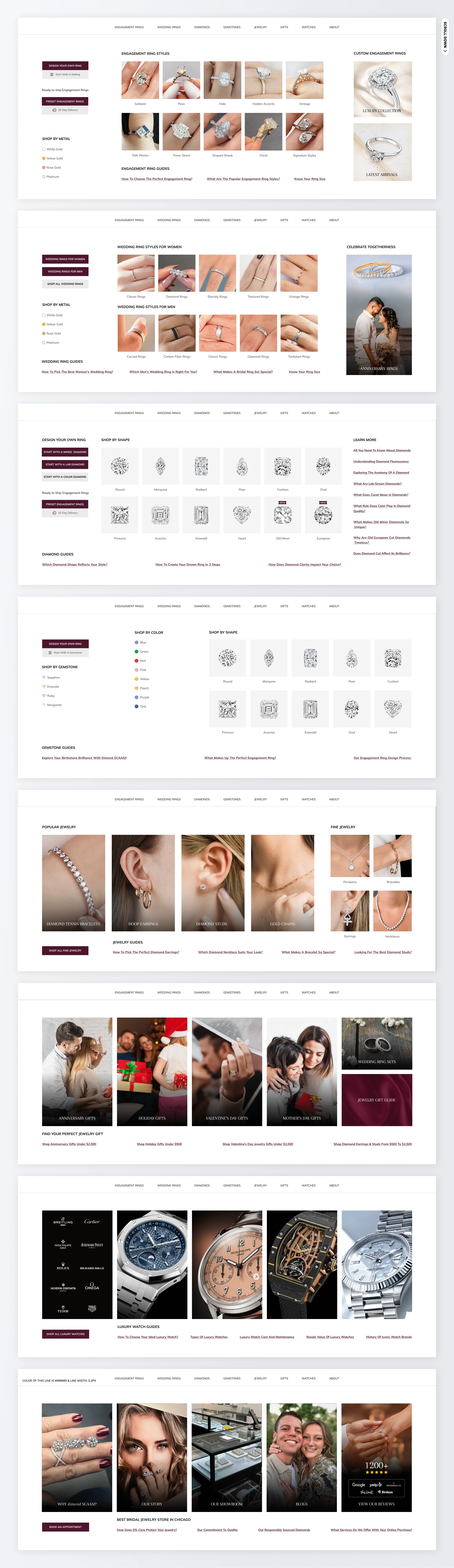 Each block is designed for conversion intent: product cards, color contrast, typography rhythm, and section hierarchy guide the eye toward the items that drive the most revenue. Ring and diamond CTAs are more visible, and supporting sections communicate customization, certification, and sustainability — all critical decision drivers in engagement ring shopping.