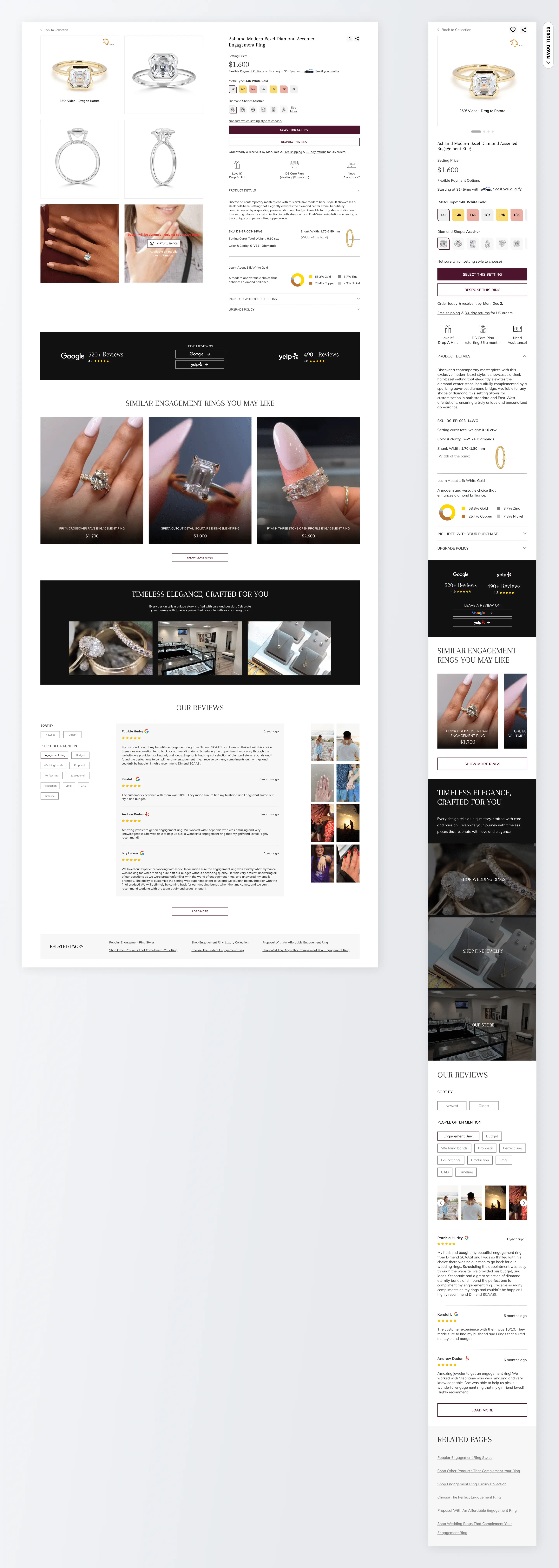 The engagement ring PDP incorporates more detail without overwhelming the user. The layout highlights ring imagery, diamond options, pricing transparency, and personalization choices early in the flow. Secondary content like certificate details, carat explanation, and delivery timelines are added as expandable sections to support informed purchase decisions without increasing cognitive load.