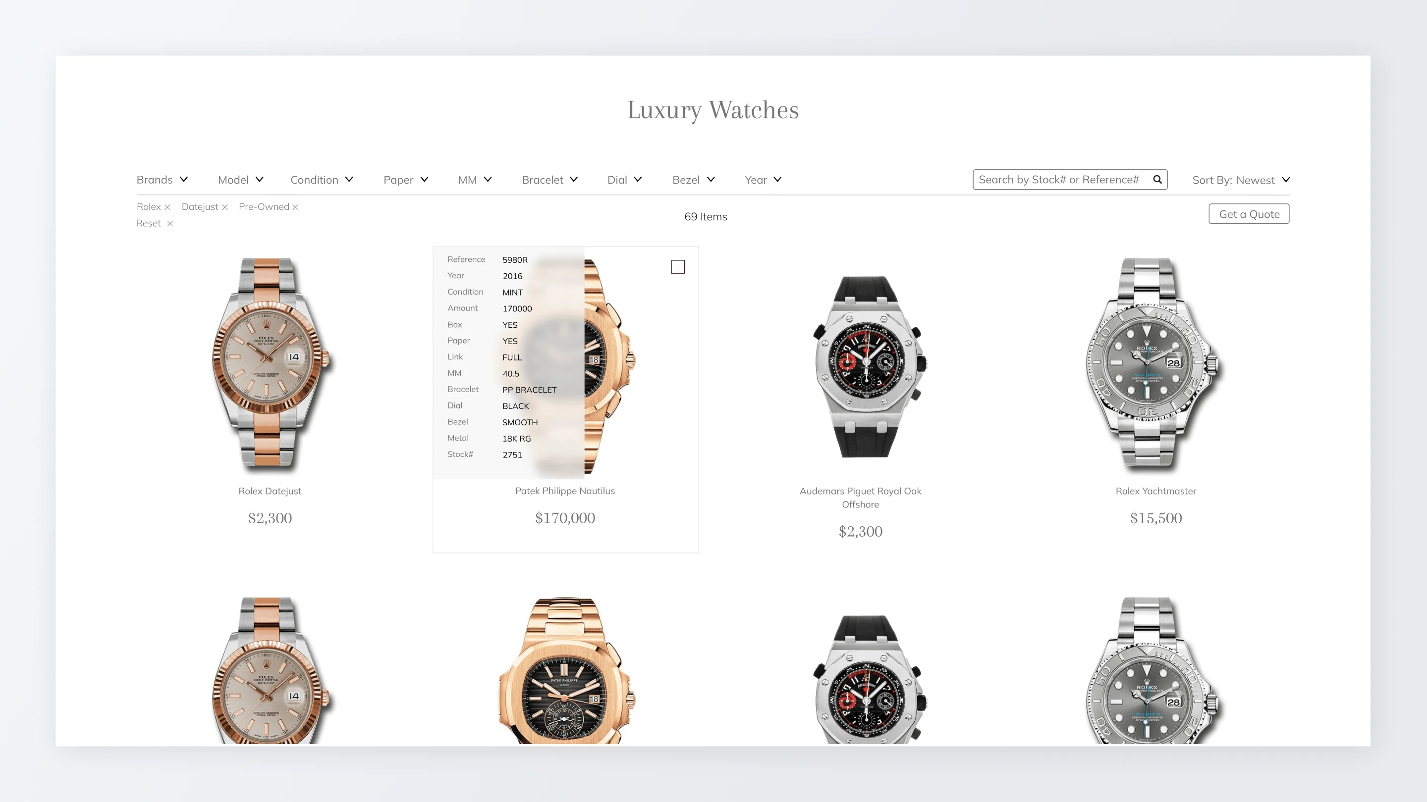 The UI emphasizes model families, condition, certification, pricing visibility, and direct inquiry actions. The card grid uses more negative space, restrained color, and technical typography to communicate luxury, especially for brands where pricing transparency builds trust. The mobile layout makes comparison easier through scrollable filters and consistent card proportions.