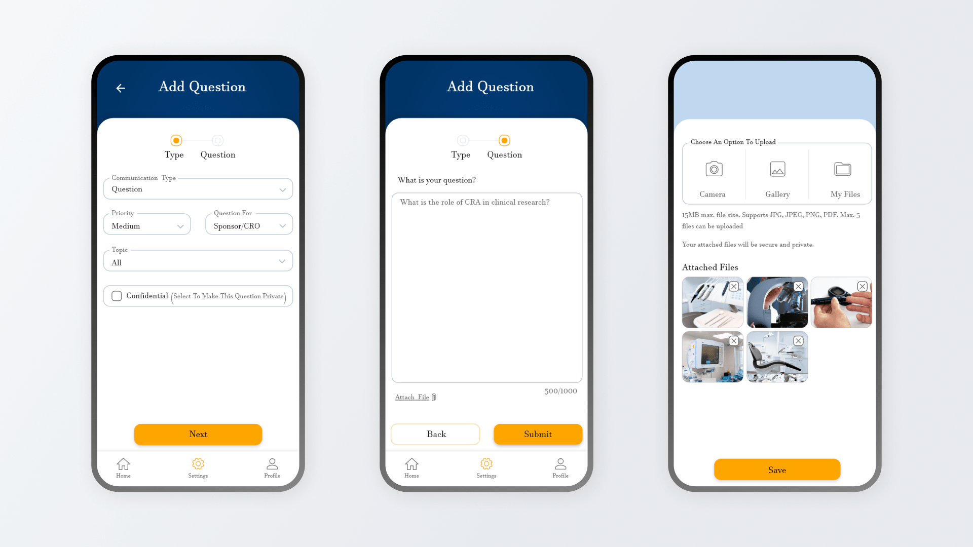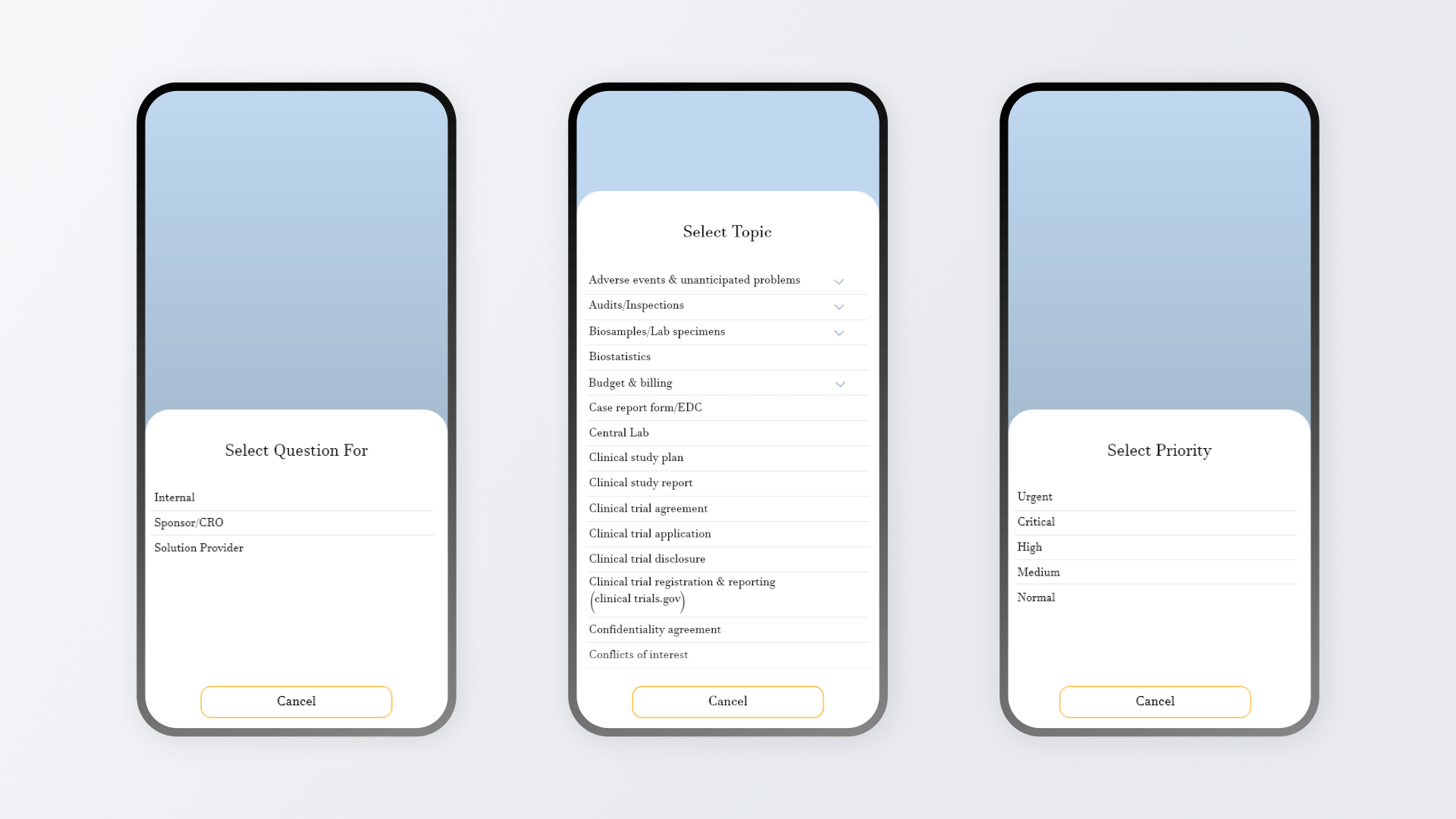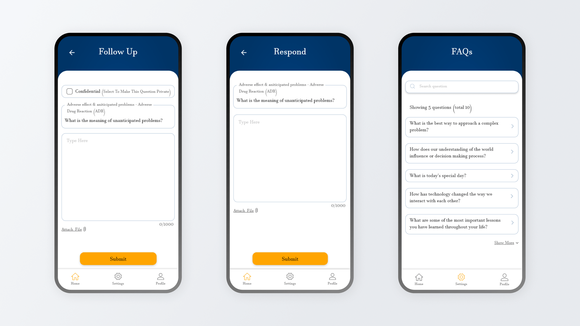 The core experience centers around asking questions, responding, and following up within defined medical and research contexts. The UI was designed to support different communication types such as questions, problems, and suggestions while maintaining structure and accountability.