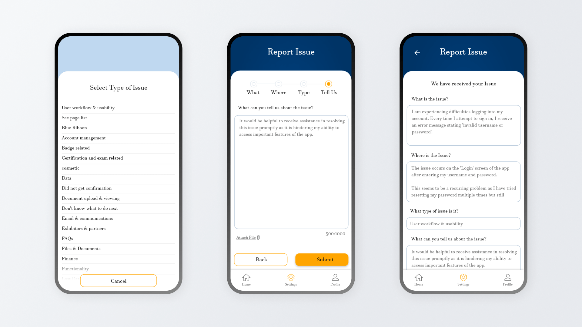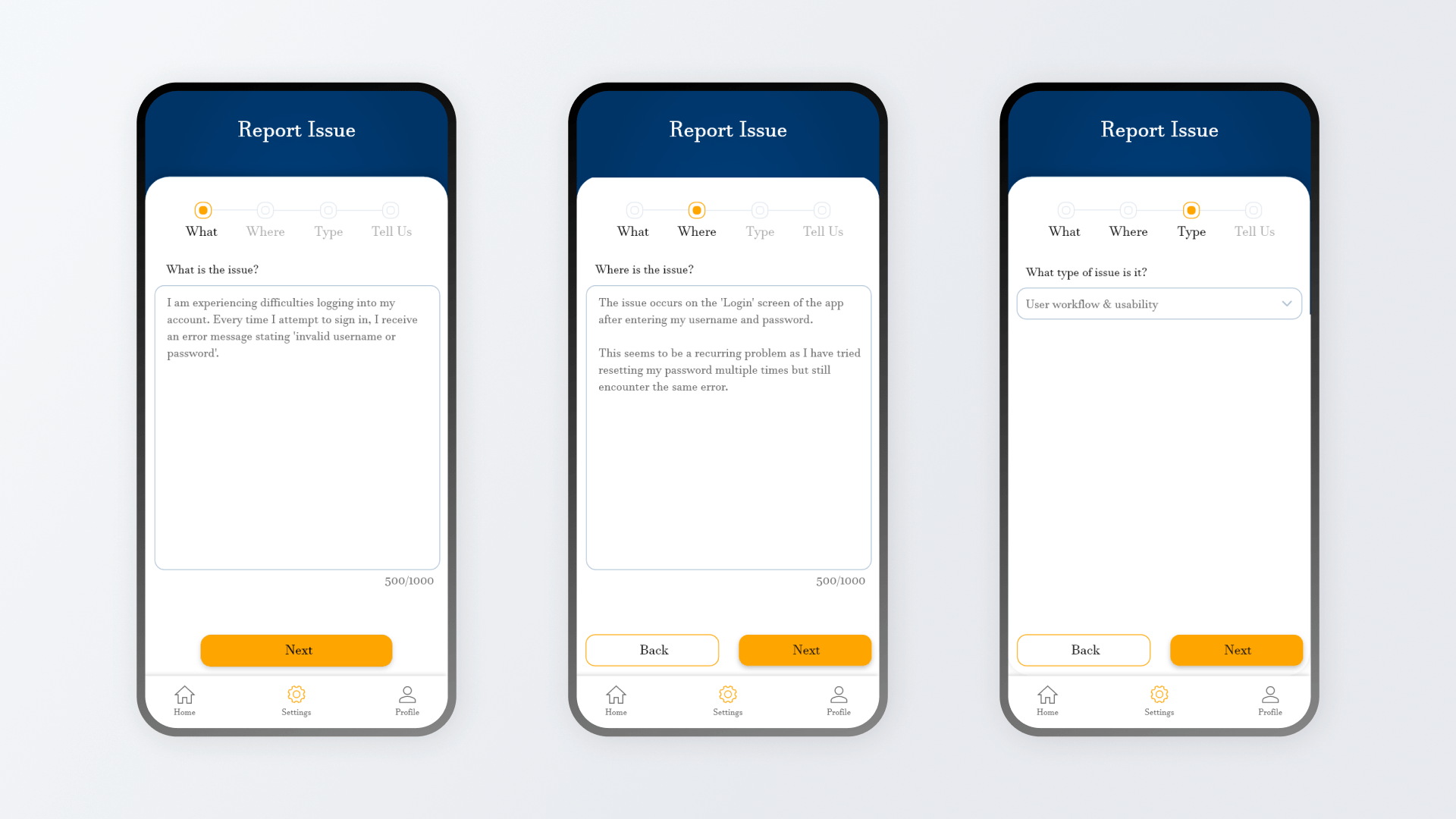 Several flows within the product involve multi-step inputs, particularly around issue reporting and problem escalation. These flows were designed to balance completeness with usability, ensuring that essential information is captured without overwhelming the user.