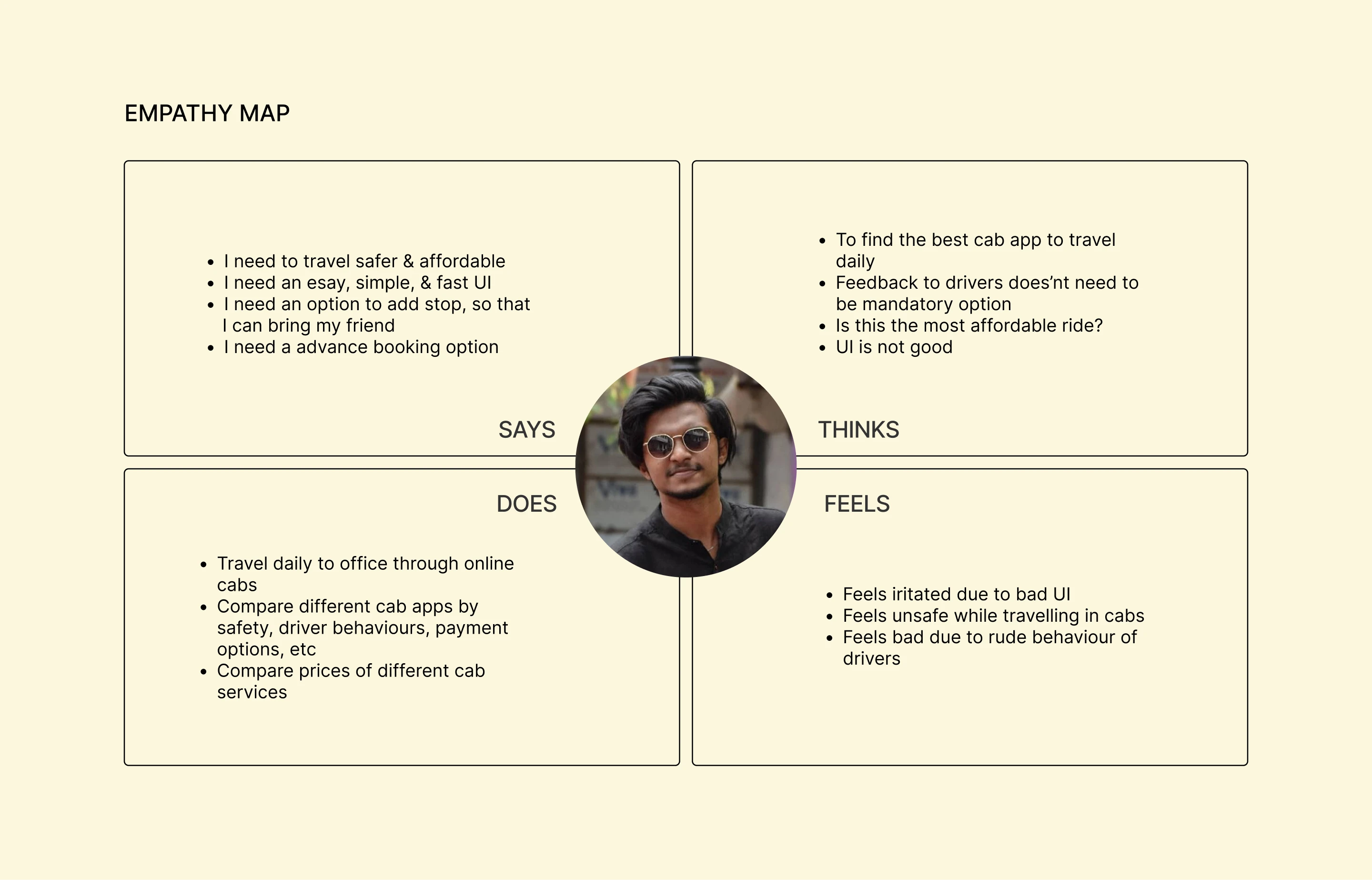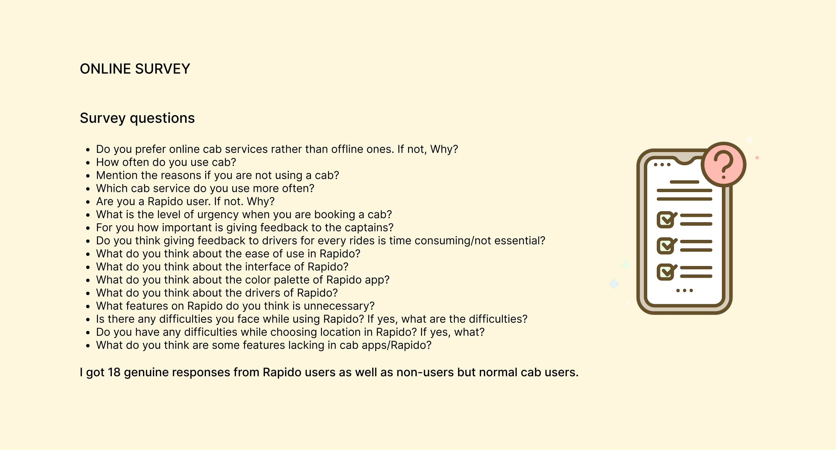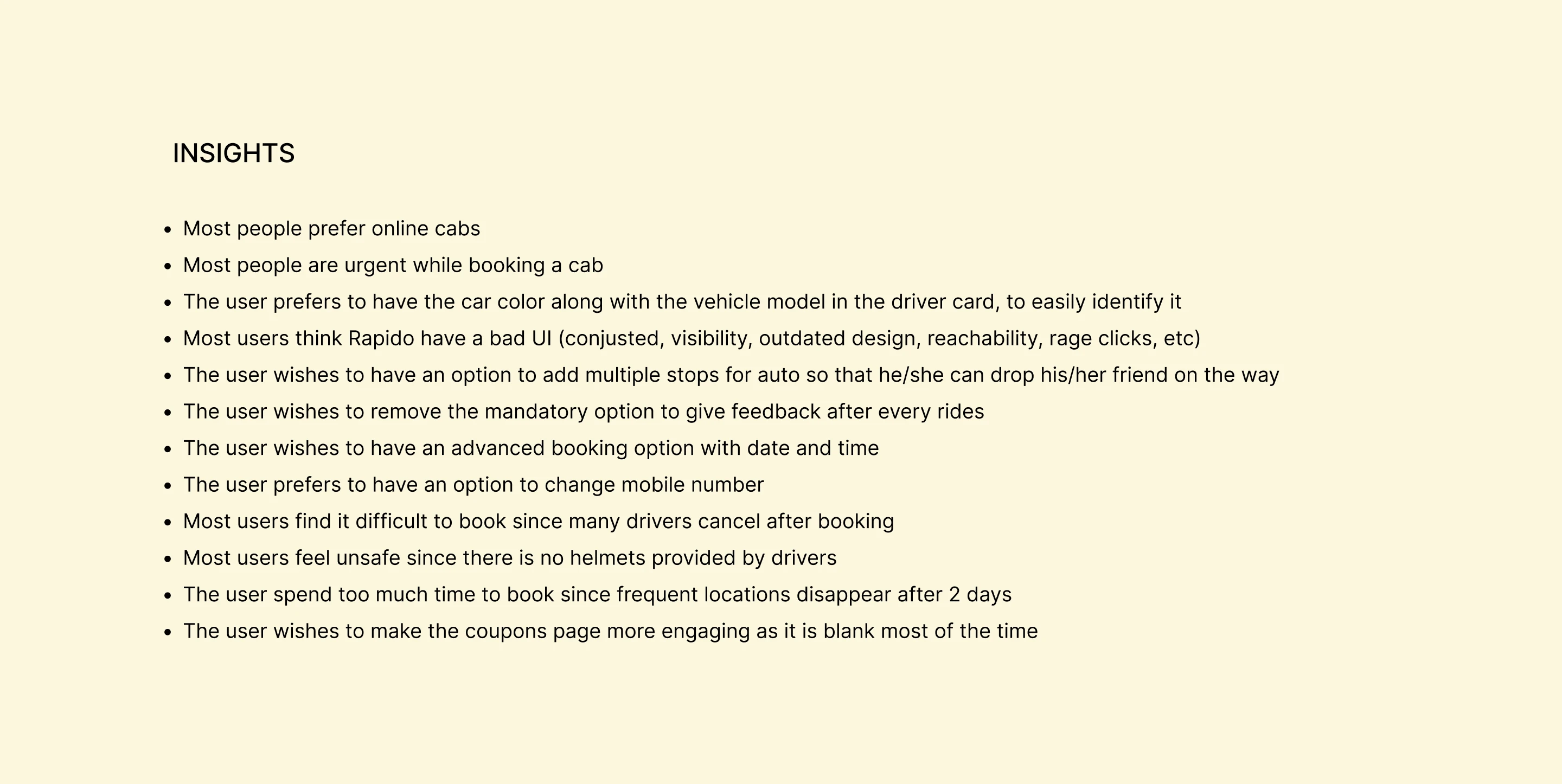 I have tested the app with 5 users, all of them where Rapido/experienced taxi users. Using the interactive prototype I made using Protopie, I asked them to perform core tasks like booking a ride, change the phone no. , schedule a ride, find the power pass option, etc, to find if the user flow is fast, easy & not confusing.