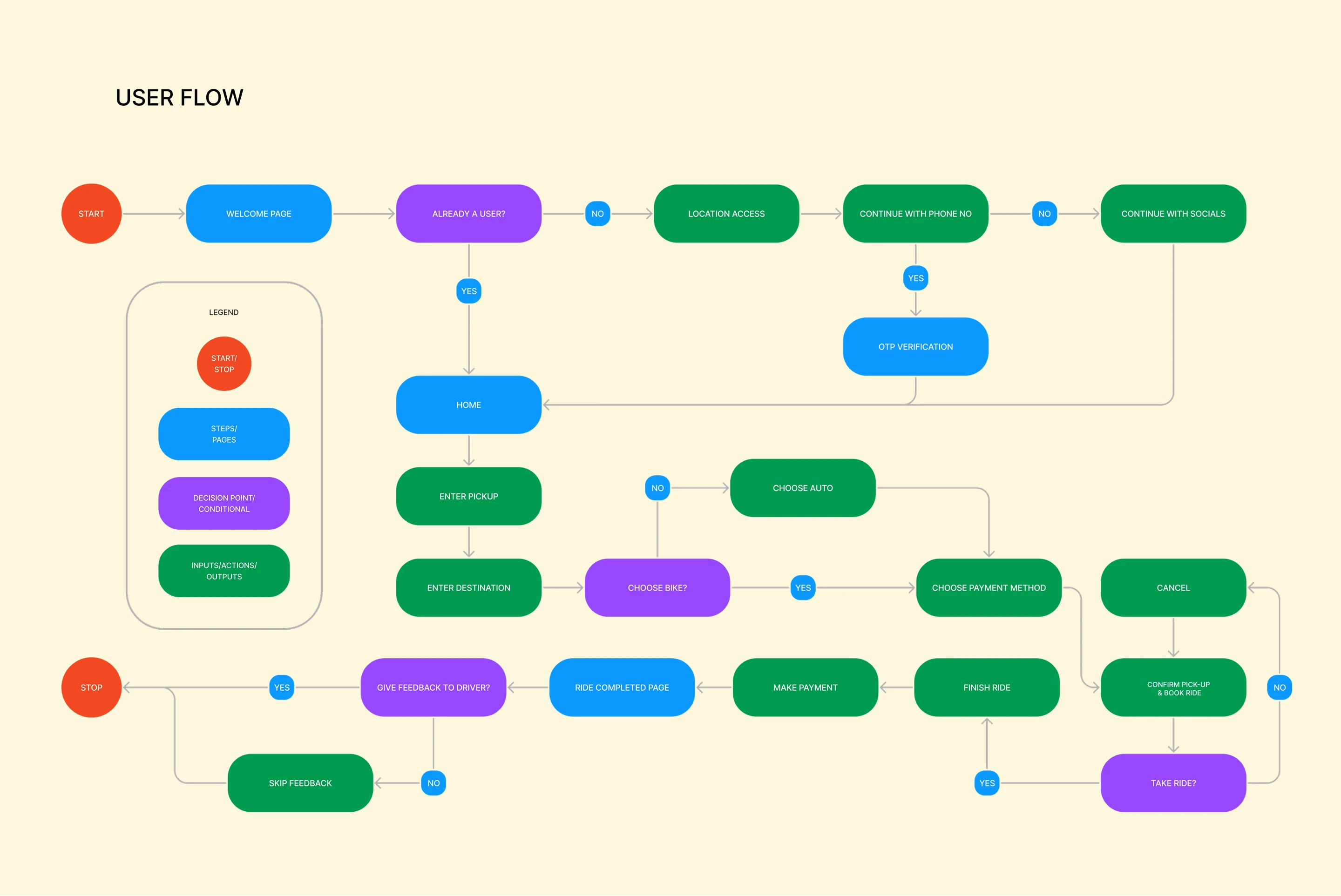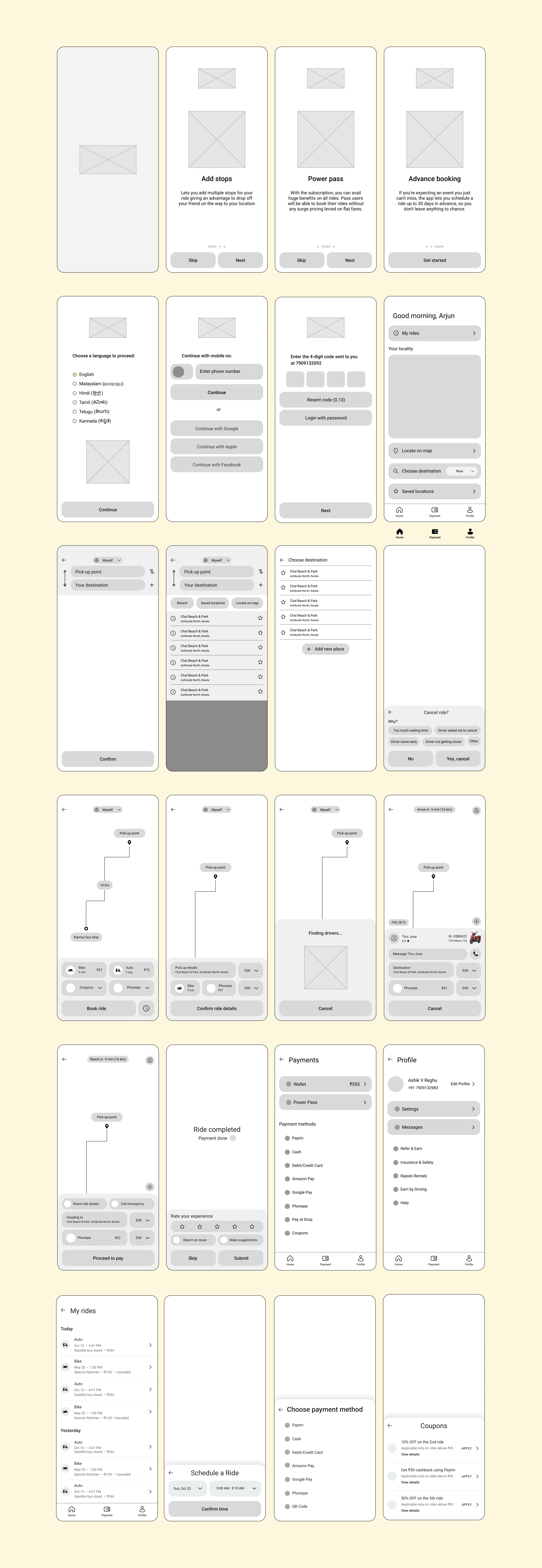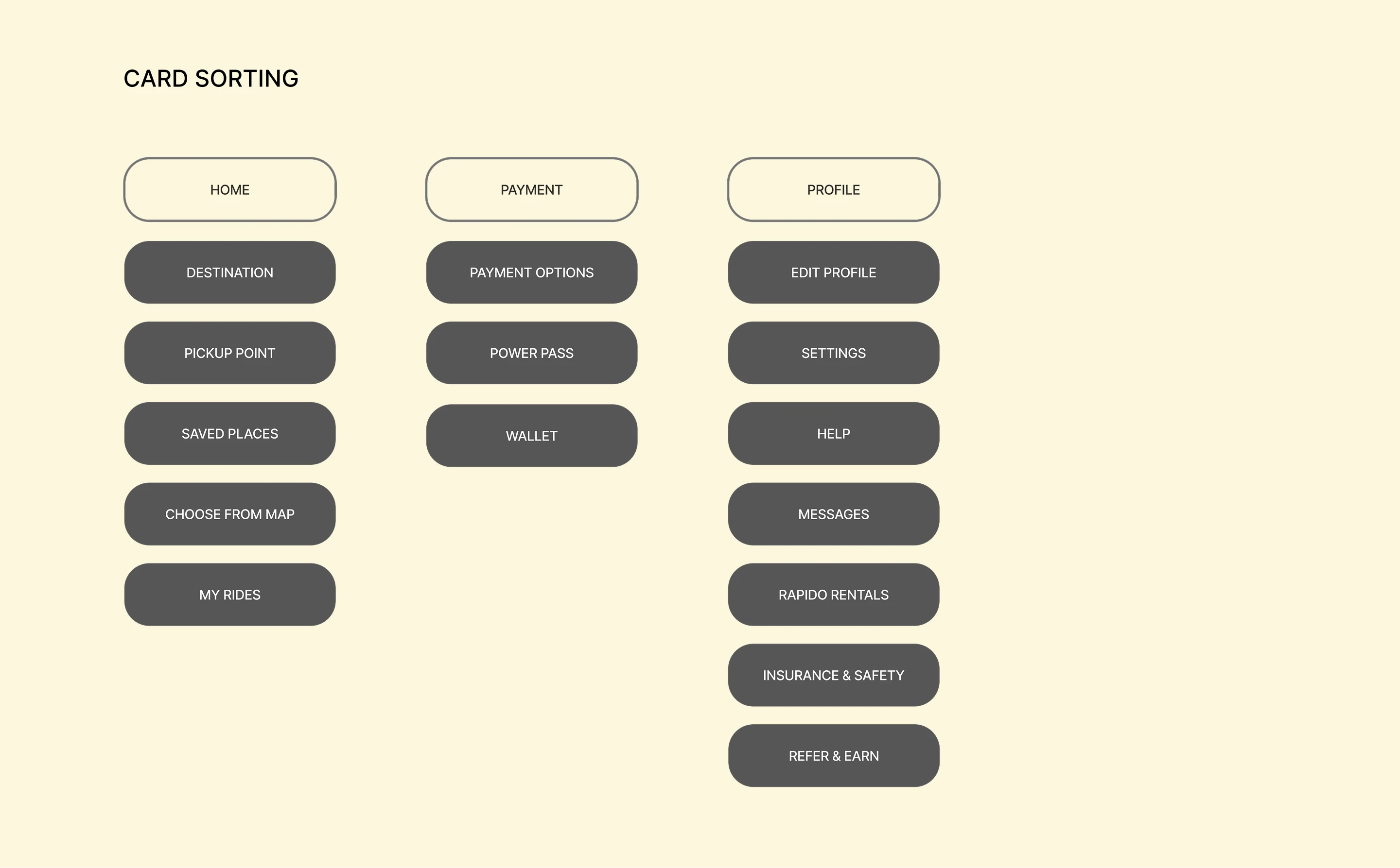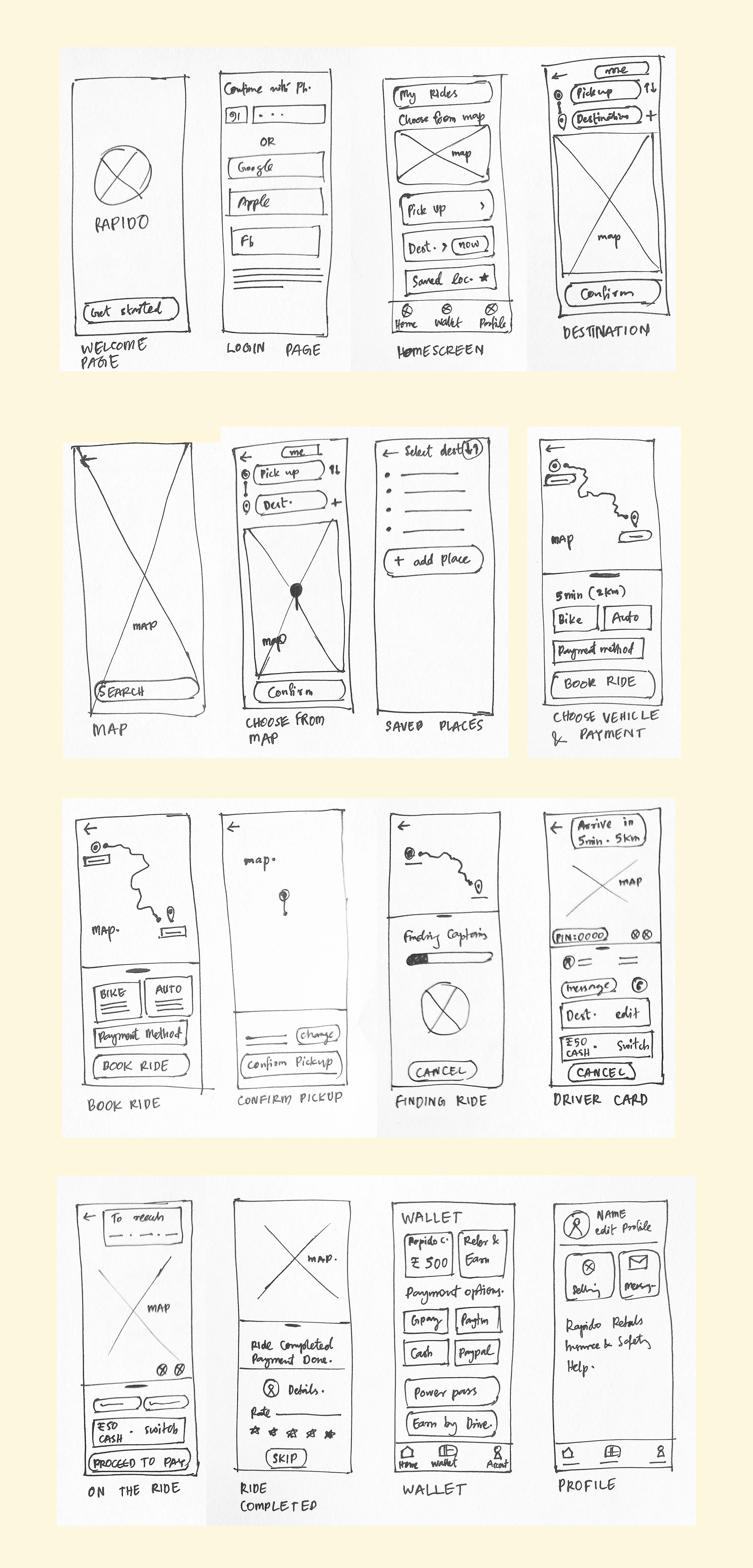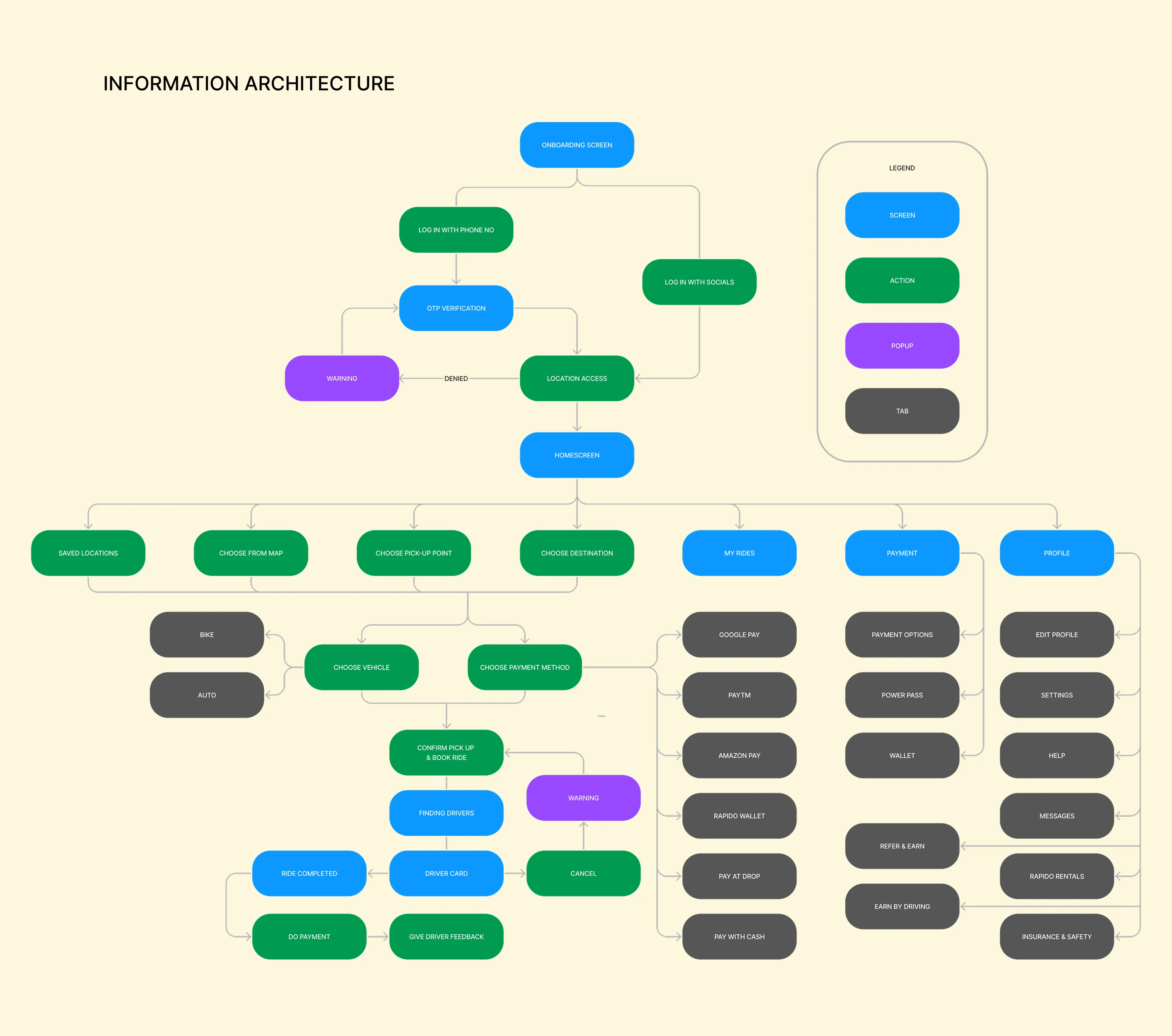 These are the final USER FLOW, CARD SORTING, & INFORMATION ARCHITECTURE, I made in Figma is a result of a lot of brainstorm sketches I done in paper to find the easiest, effective, and fastest possible way to complete the task/ride, keeping in mind the insights from the research, Hick’s law(states that more options in UI makes the user to do a decision more slowly), Miller’s law(states an average person can keep 7(+or-2) items of info at a time) of UX, and design principles.