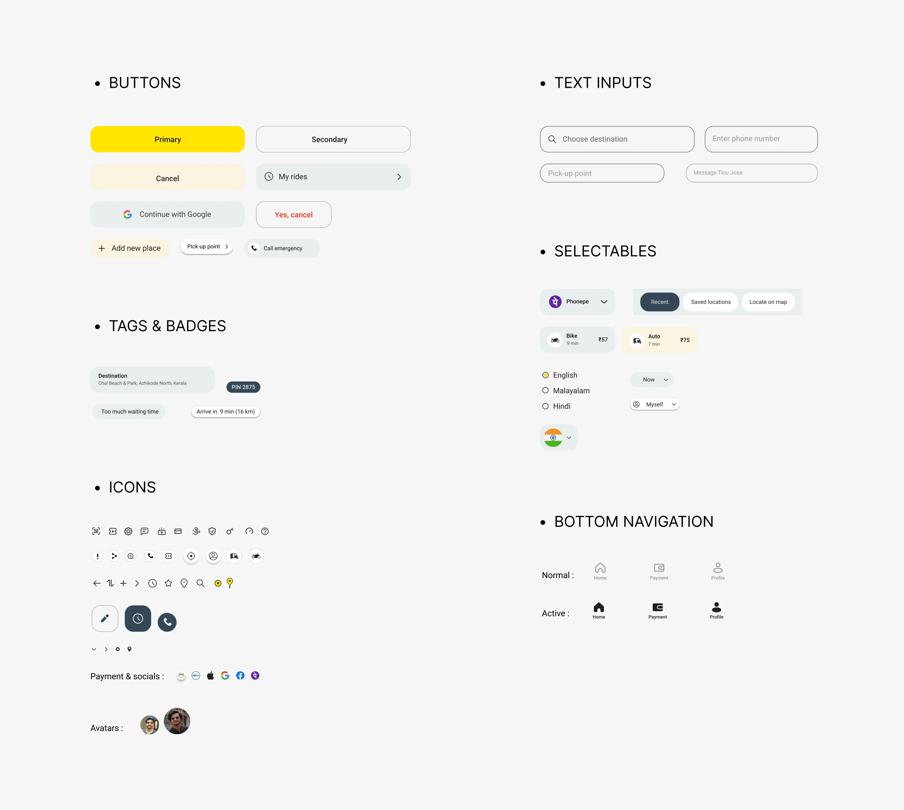 For login I made phone number as the primary option and socials as the secondary option, since most cab users prefers to continue with their number. After that there is OTP verification and location access.